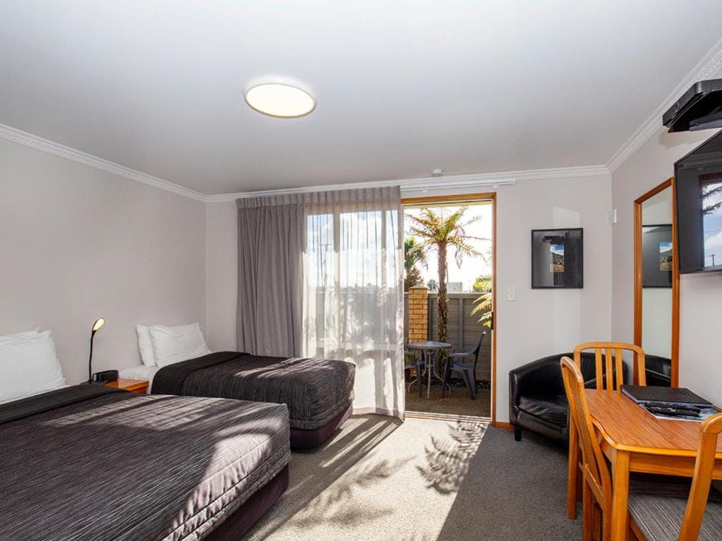 One queen bed and one single bed. Smart TV 43", cooking facilities include microwave, electric frypan, ceramic cooktop with two hotplates and tea/coffee making facilities. Great selection of teas and coffees including Tuatara plunger coffee. Units are either on the ground floor with a sliding door to a private courtyard or upstairs with a sliding door to a balcony with outdoor seating (preference if stated will be accommodated if possible).